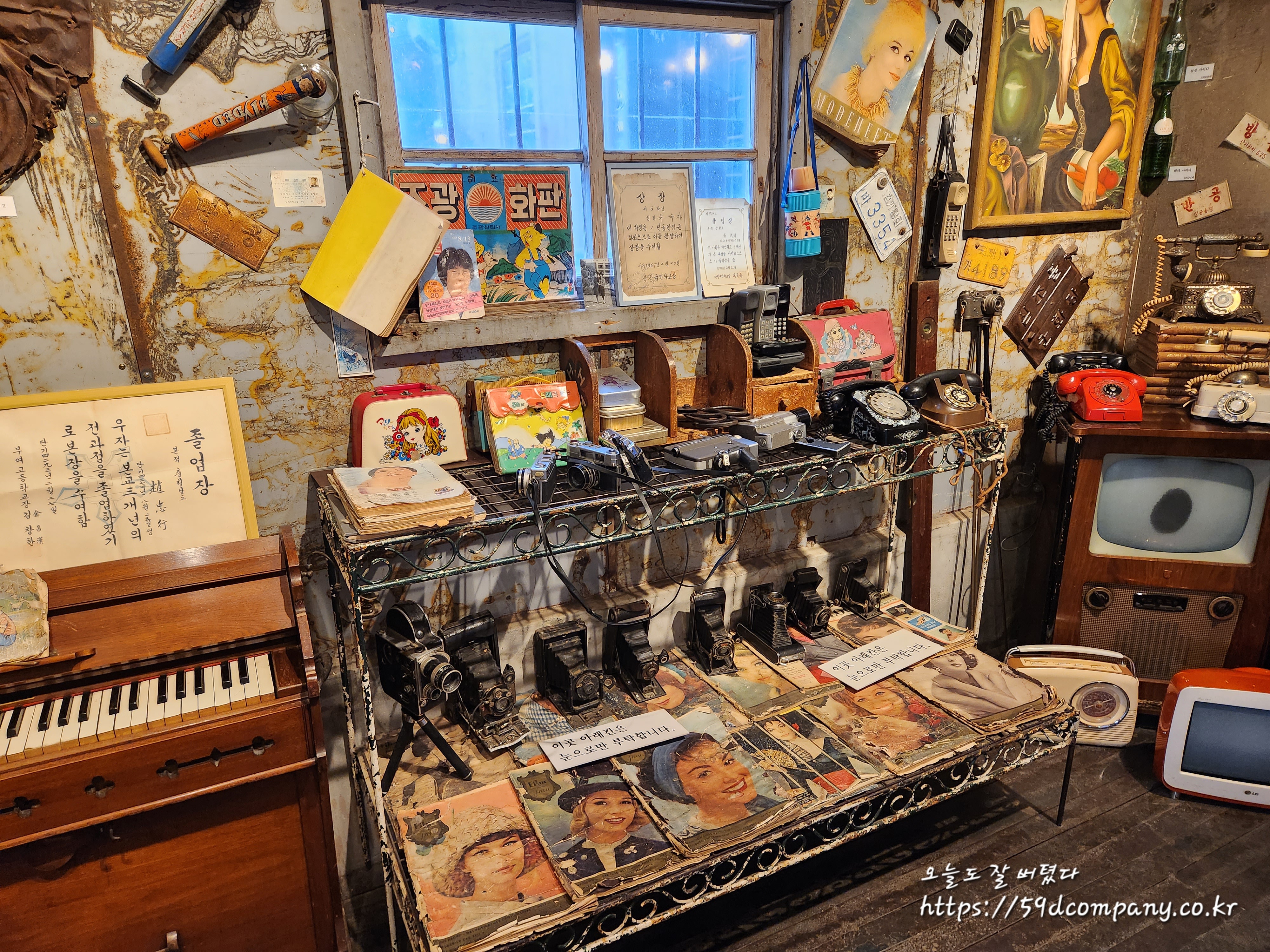 내부에는 레트로 느낌 물씬 풍기는 버스나 옛날 전화기 등등 아기자기한 소품 많아서 구경하는 재미 쏠쏠했는데요.